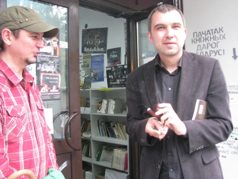 Лявон Вольскі і Альгерд Бахарэвіч на ганку кнігарні "логвінаЎ"